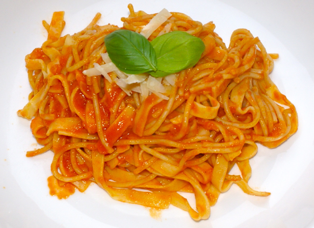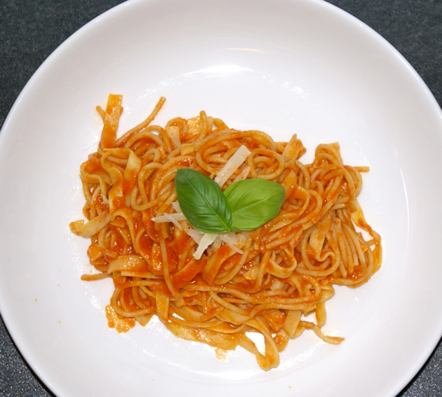 Det er ikke ofte vi lager noe som faktisk kan ligne på vegetar og ikke har kjøtt. Vi hadde egentlig ikke noen god grunn til å droppe kjøtt i dag, det bare føltes ut som at det kunne vært godt og når jeg da kom over en særdeles innbydende pastaoppskrift på nettet var det enkelt. Jeg gjorde noen enkle justeringer, men Pasta Al Pomodoro er egentlig ganske fritt variere. Pomodoro er Italiensk for tomat, slik at Pasta Al Pomodoro betyr, pasta med tomat. Dersom du ikke har skåldede tomater på boks kan du bruke vanlige tomater. Bare husk at de skal være uten skinn og uten innmat (den kan siles). Det er ikke noe spesielt godt når man kjører frø(?) og skin i blenderen.