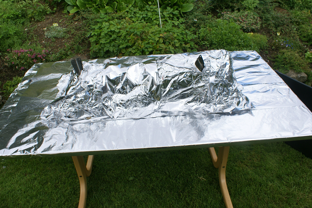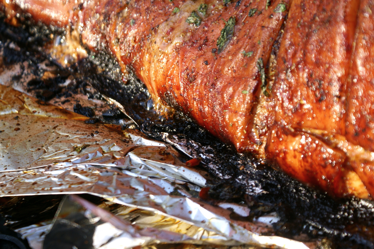 Prosedyren var den samme som sist; tilpasse grisen så den får plass på grillen og la den ligge på rist med flere lag aluminiumsfolie i mellom. Kullet blir lagt i to langsgående renner slik at varmen er mest mulig indirekte. Siden det er lokk på grillen blir det bra med varme. En svinestek skal tross alt ikke stekes på mer enn rundt 125 grader, så her er det mer å ta tiden til hjelp. Det å beregne steketid på en gris er vanskelig, spesielt når man ikke har helt kontroll på varmen hele tiden, men totalt brukte vi vel 6 timer fra den ble lagt på grillen til den var helt ferdig stekt i år. I fjor sommer brukte vi vel drøye 7 timer på nesten like stor gris.